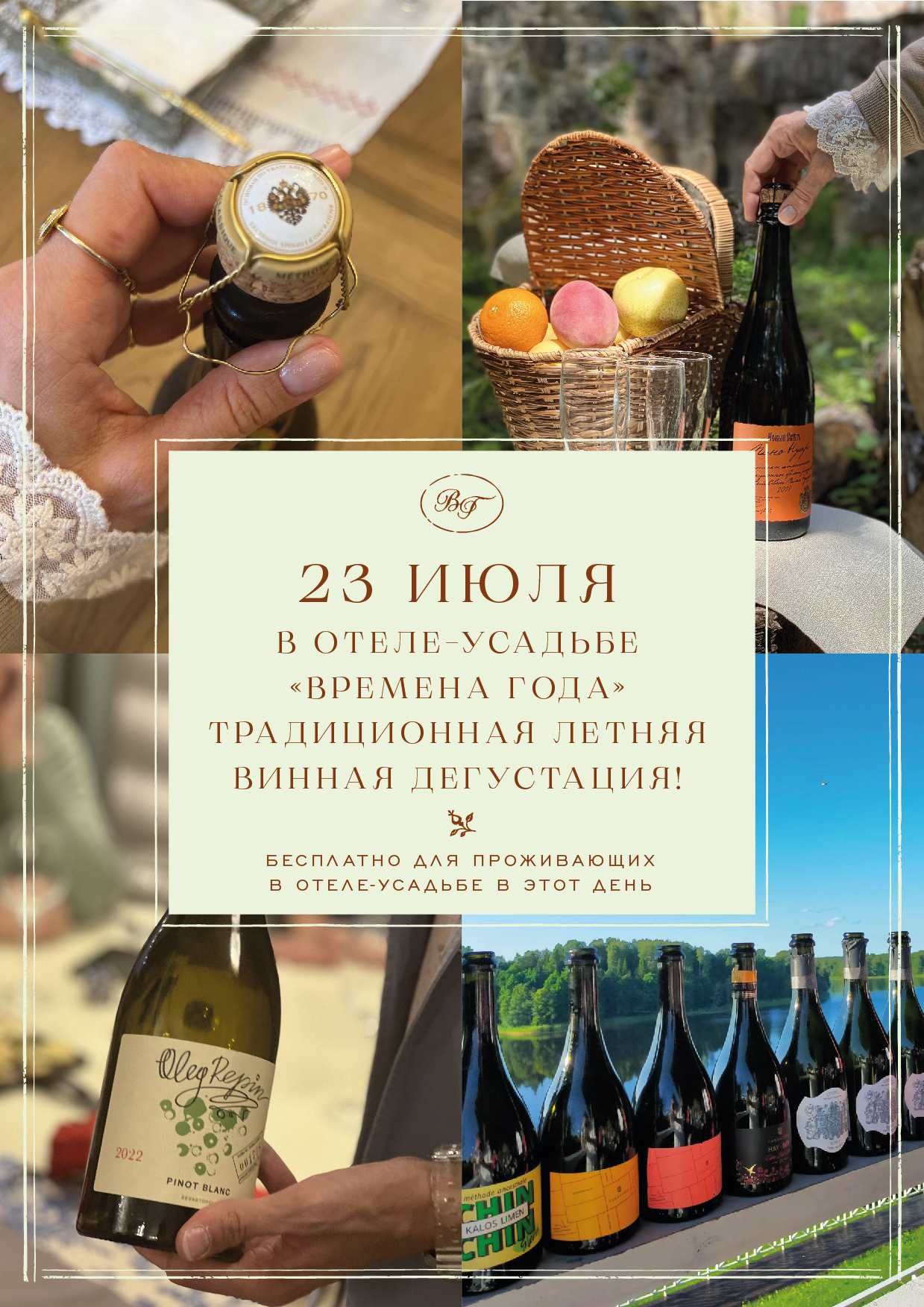 23 июля, в среду, отель-усадьба «Времена года» приглашает Вас на уютную винную дегустацию с видом на озеро Наговье.